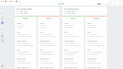 This handy template helps you list out all the gear you need for a successful shoot from start to finish. You can customize it to suit your workflow, set it up for multi-day shoots, and view it on your phone wherever you are.