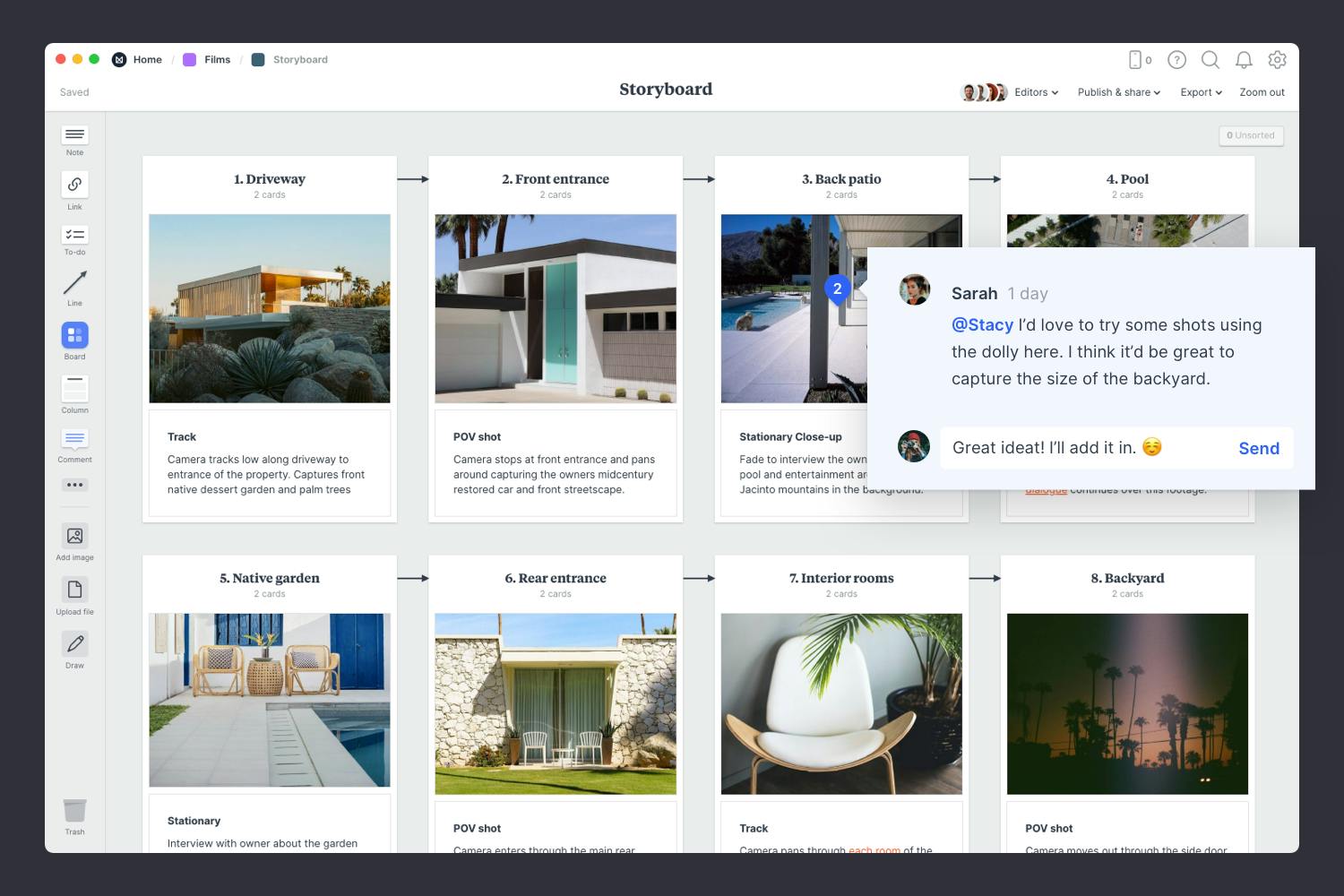 Many people devote their entire careers to storyboarding as it combines disciplines and techniques such as illustration, writing and production. Traditionally, a storyboard would be created with analog sketches, but with a modern digital tool you can use photography, animation, color and notes to highlight key characters, scenes and objects.