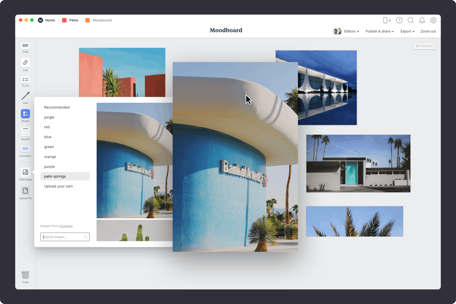 Search over 500,000 beautiful photos powered by Unsplash then drag images straight onto your board.