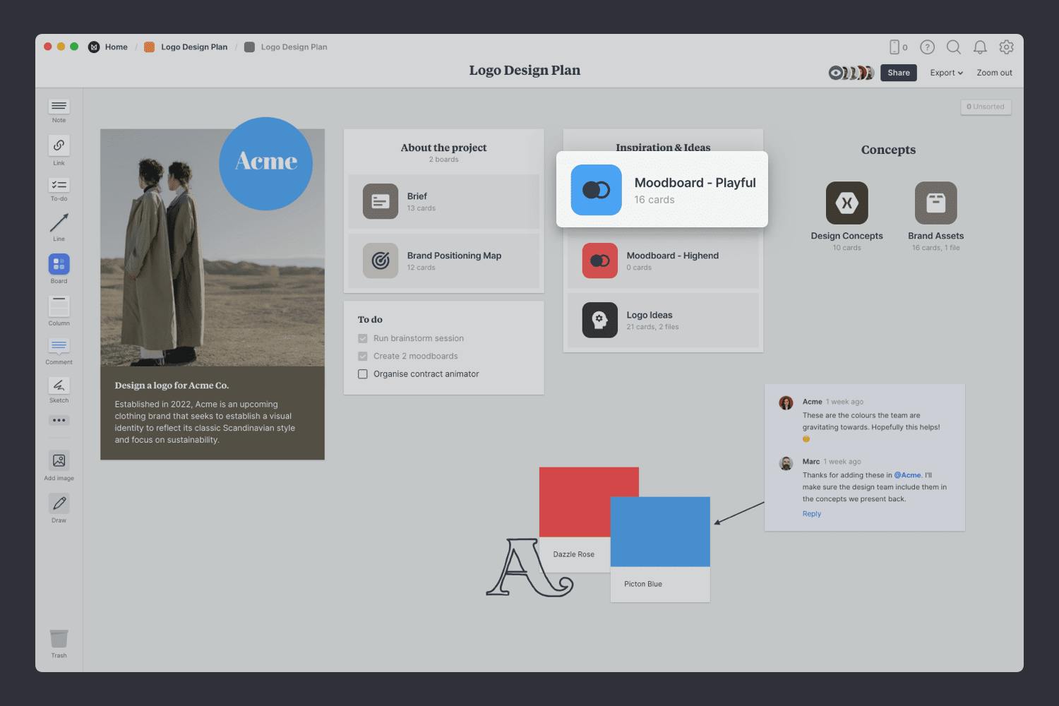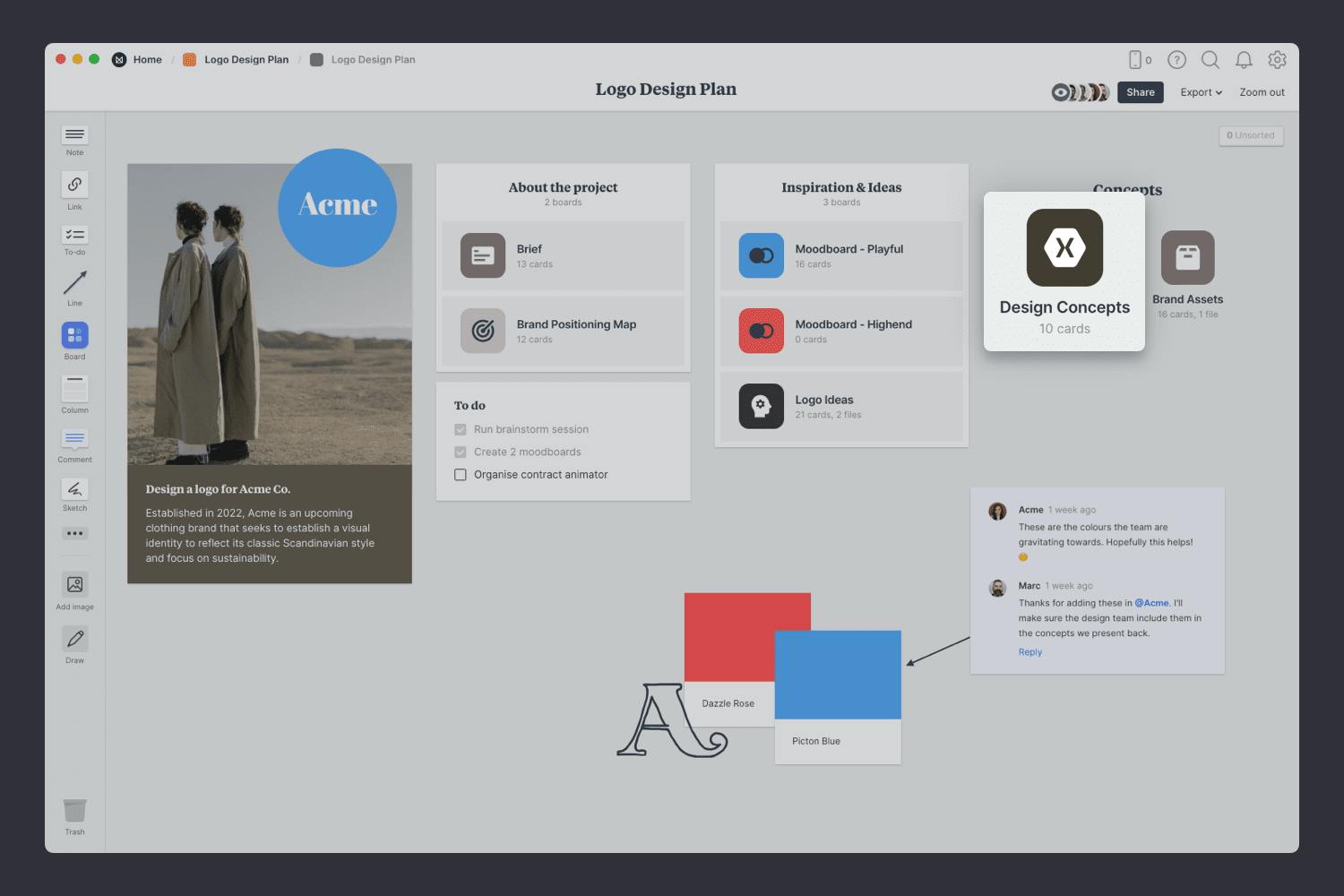 You’ll find the empty Concepts board on the Logo Design Plan board. Double-click to open it and start adding the organizing your presentation.