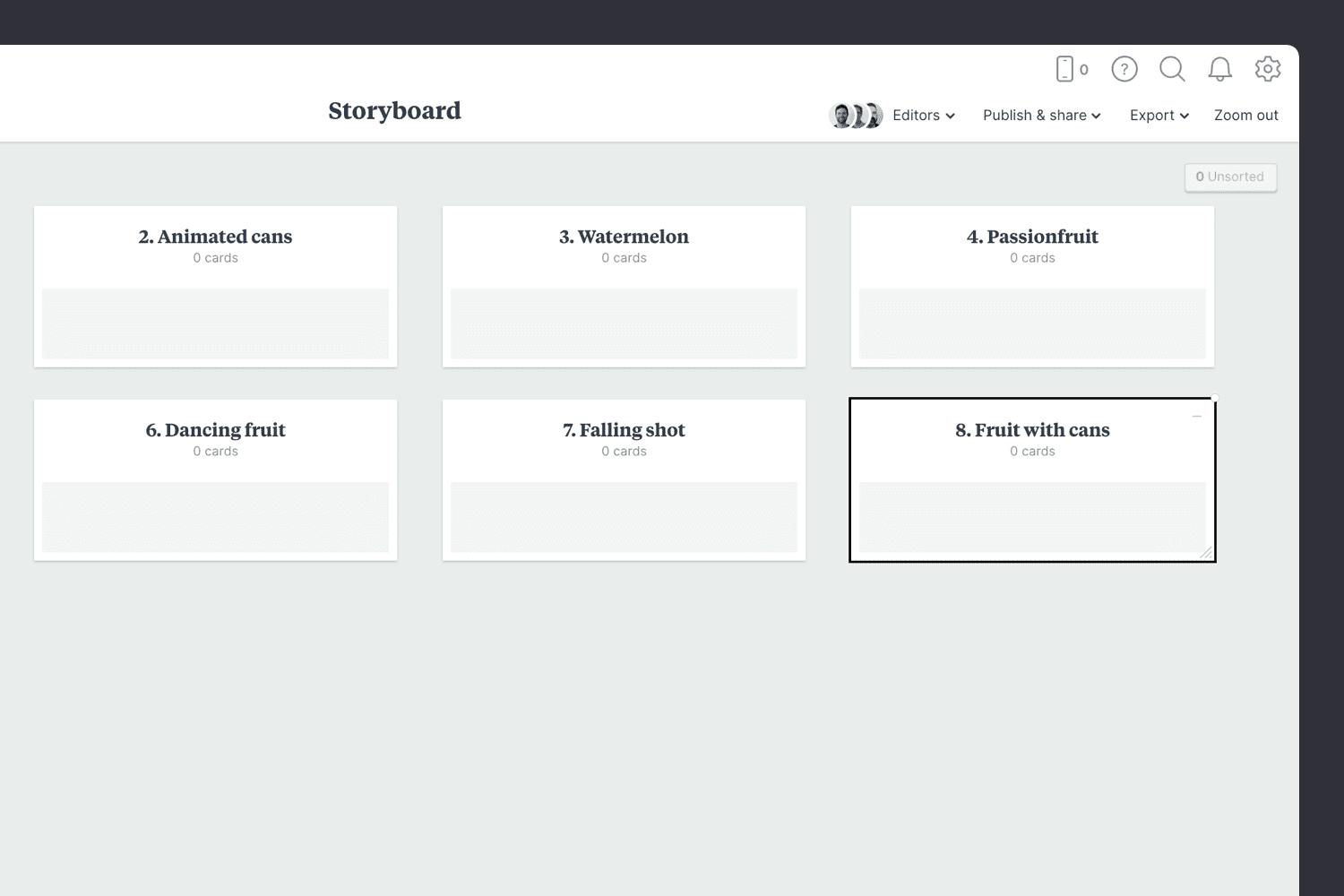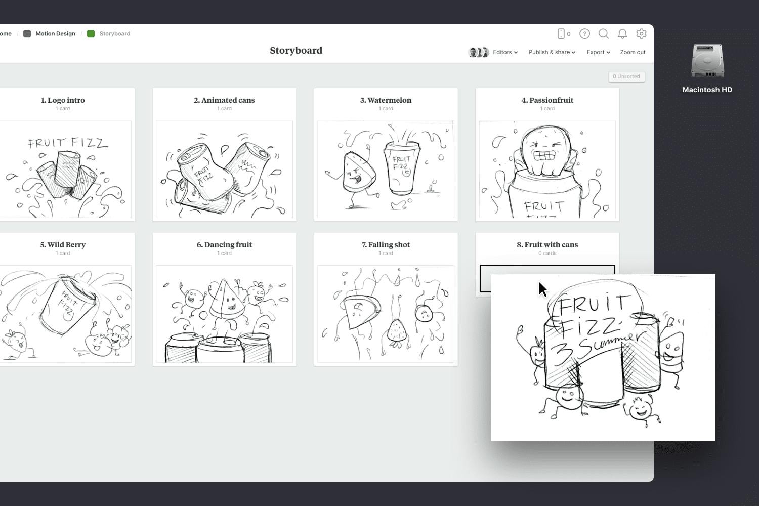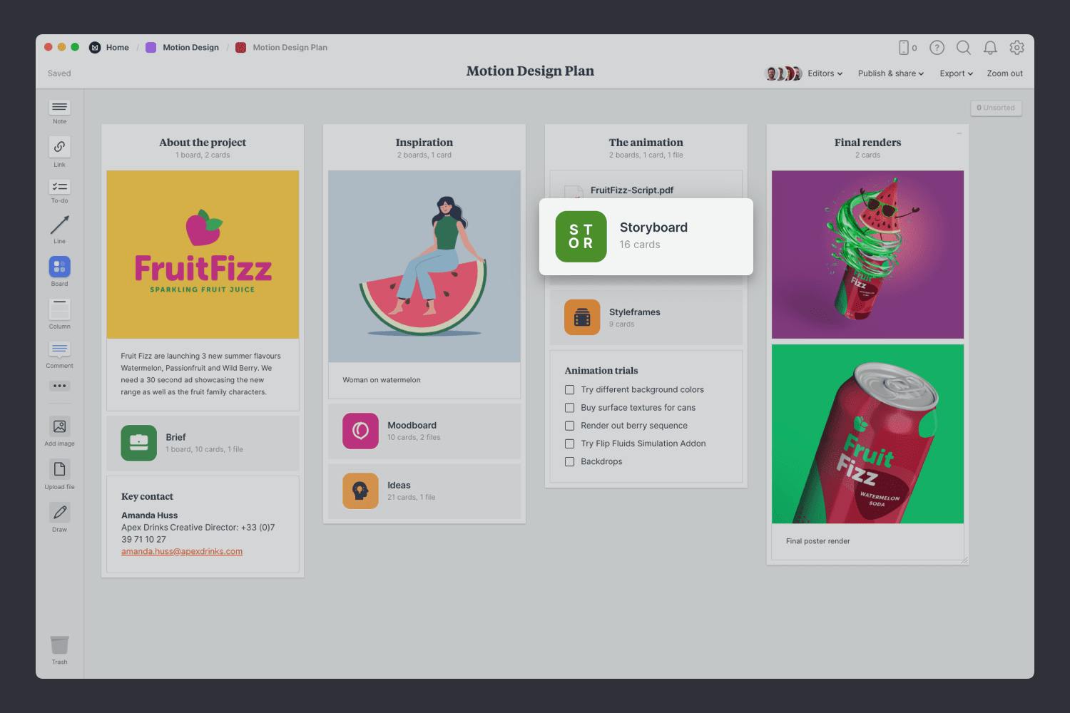 You’ll find the empty Storyboard on the Motion Design Plan board. Double-click the Storyboard to open it and start adding the mapping out the key scenes.