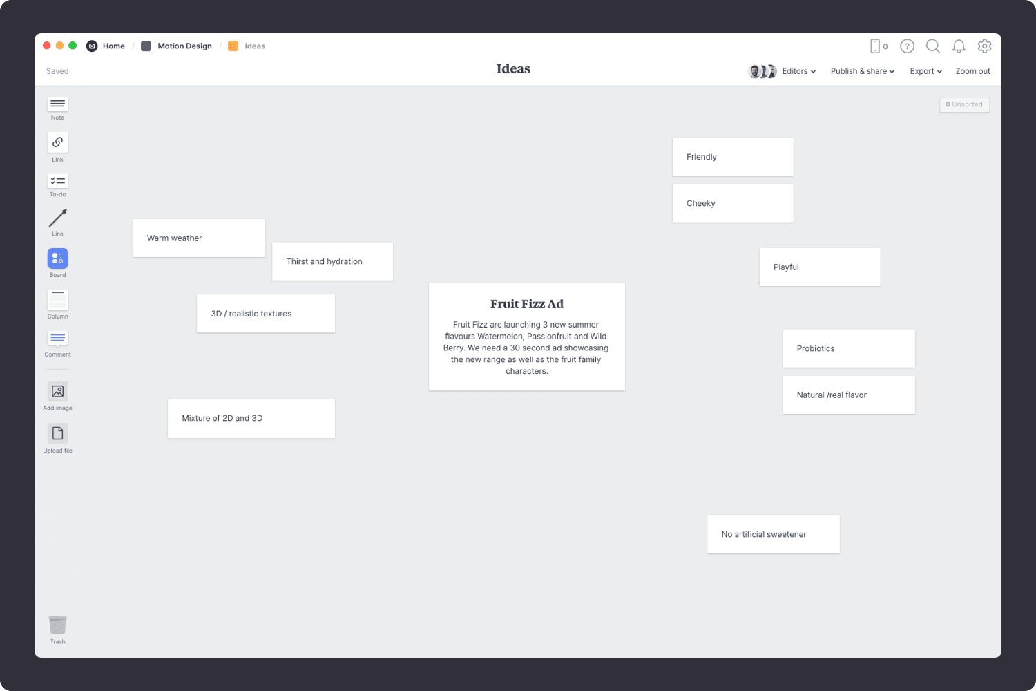 Now it's time to get creative. Start adding any ideas that relate to your main topic. Think about different ways to communicate your message, animation styles you could use, characters, or even the history of your topic. Explore every thread until you fill the board.