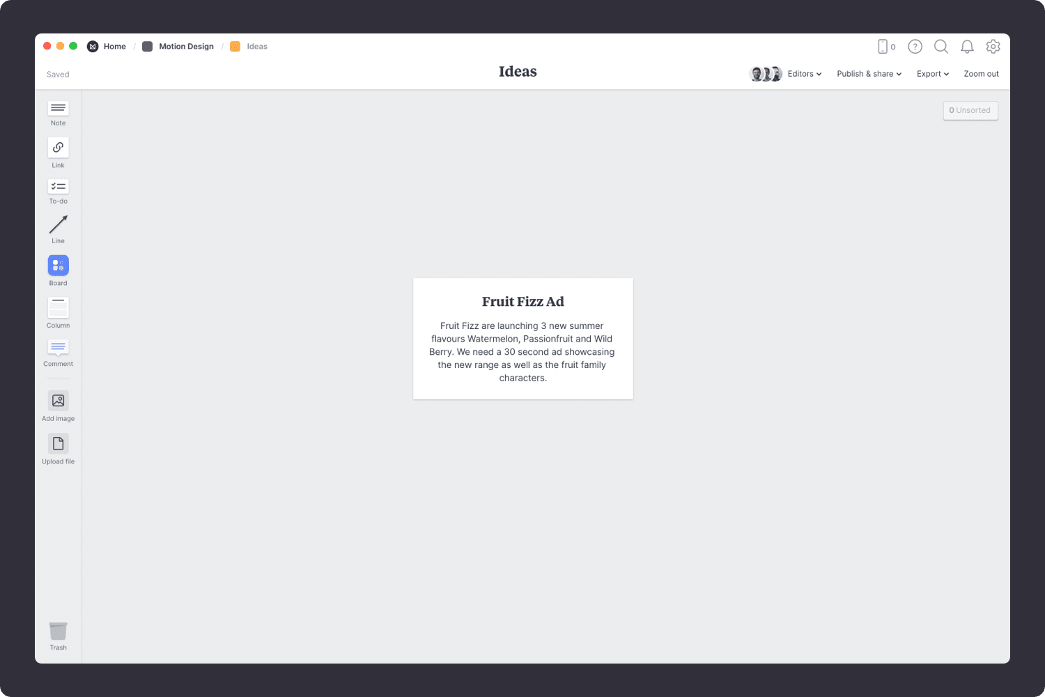 You’ll find the board for brainstorming on your Motion Design Plan board. Double-click the Ideas board to open it and start brainstorming.