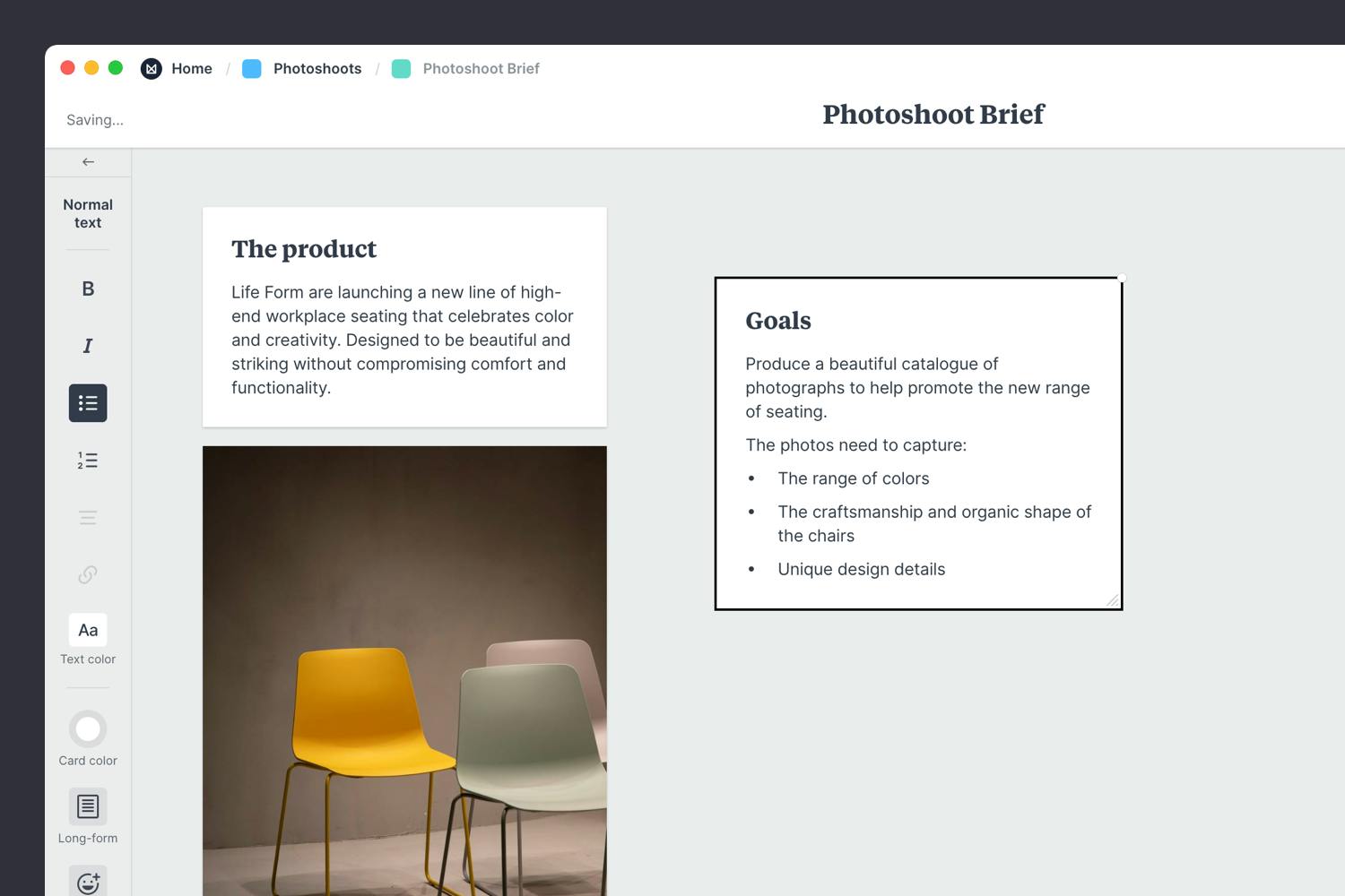 Once you’ve made any final tweaks, it’s time to share the completed brief with your team so everyone's on the same page. If you want to learn more about writing a photoshoot brief, check out our dedicated photoshoot brief guide.