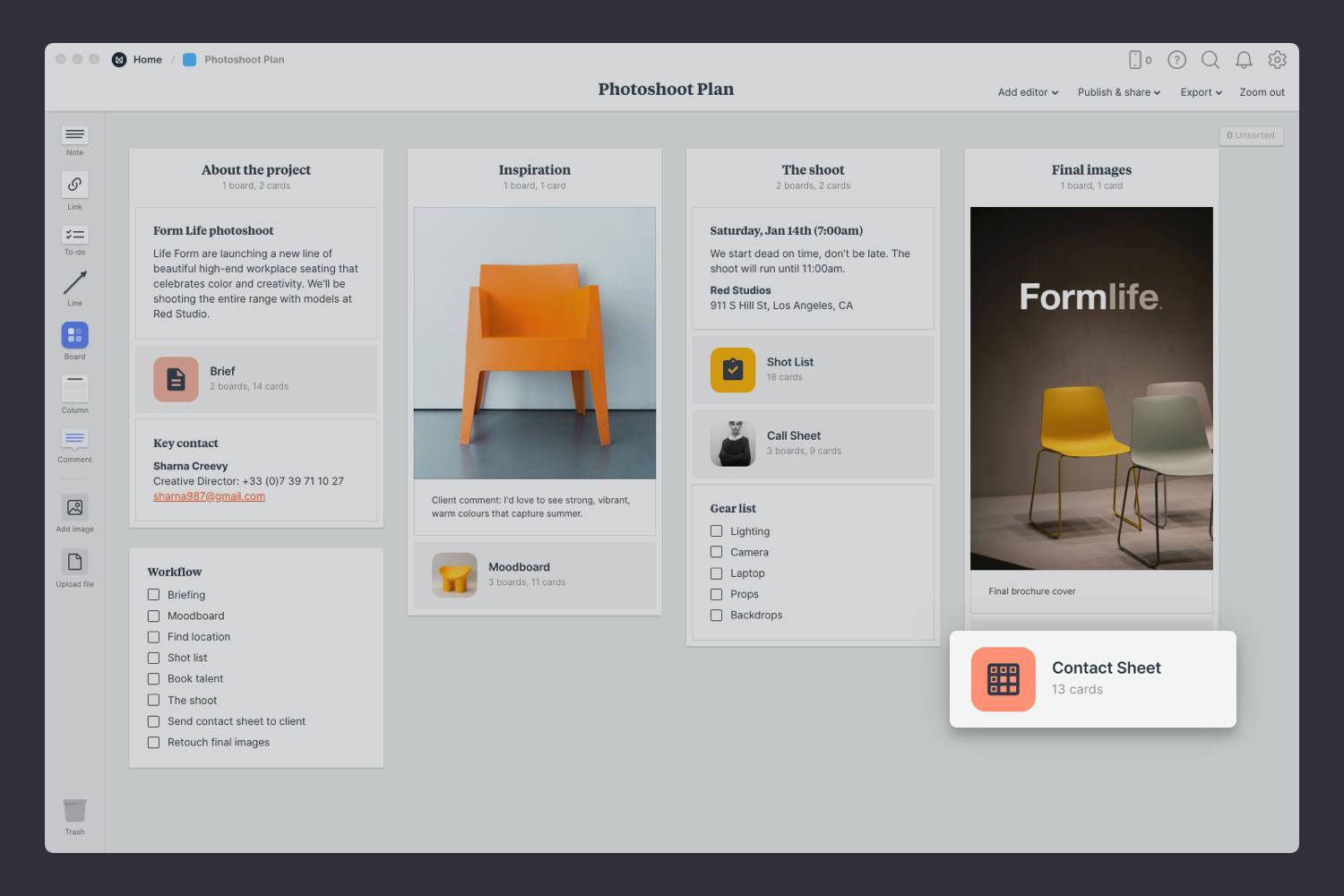 You’ll find the board to make your contact sheet on the Photoshoot plan board. Double click on the Contact sheet to open it and add your shortlist of images.