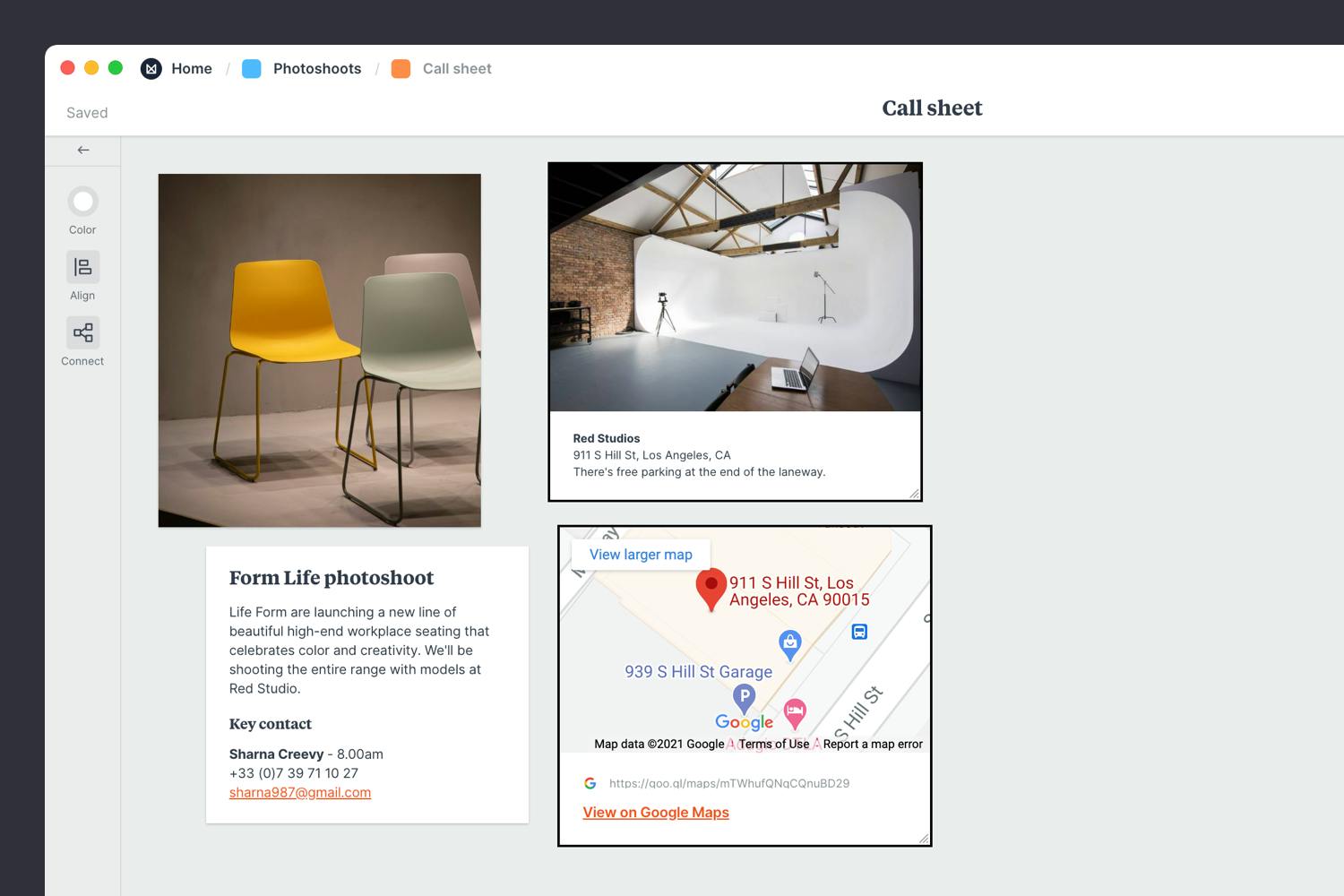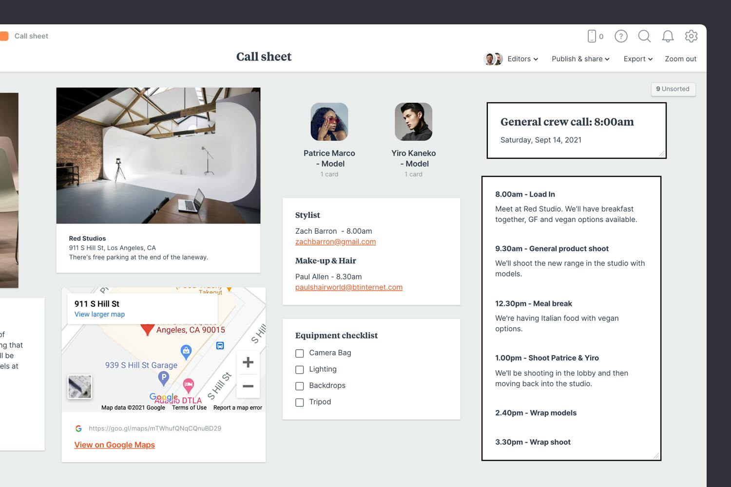 Once you have everything you need, it's time to organize your call sheet so it's easy to scan. Then share it with your team so everyone can start preparing for the shoot.