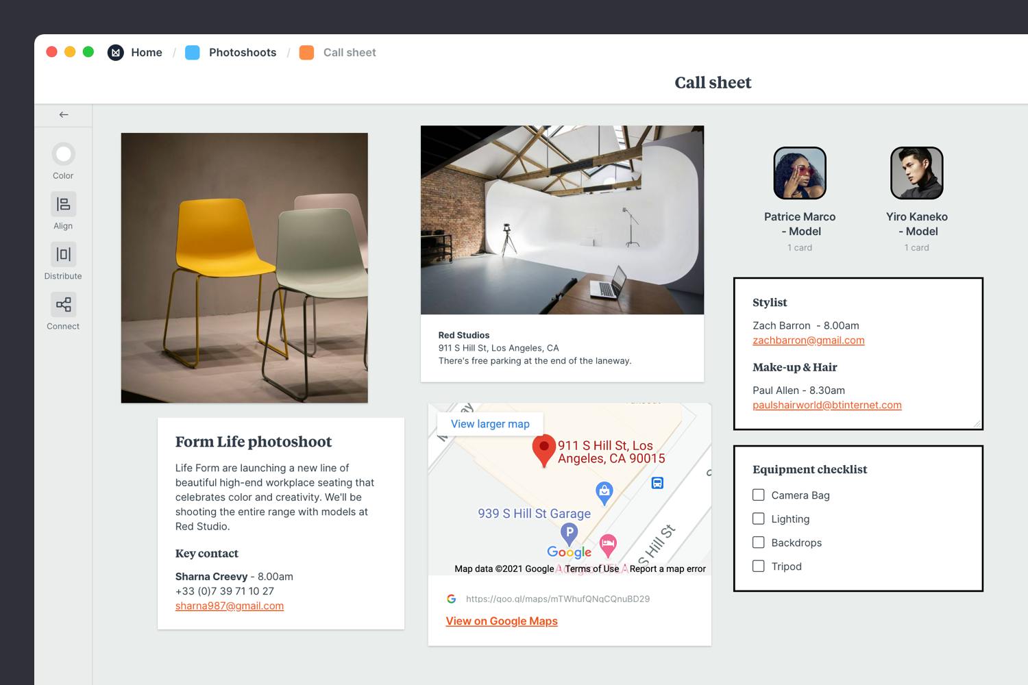 You’ll find the board to make your call sheet on the Photoshoot plan board. Double click on the Call sheet to open it and start laying out a plan for the day of the shoot.