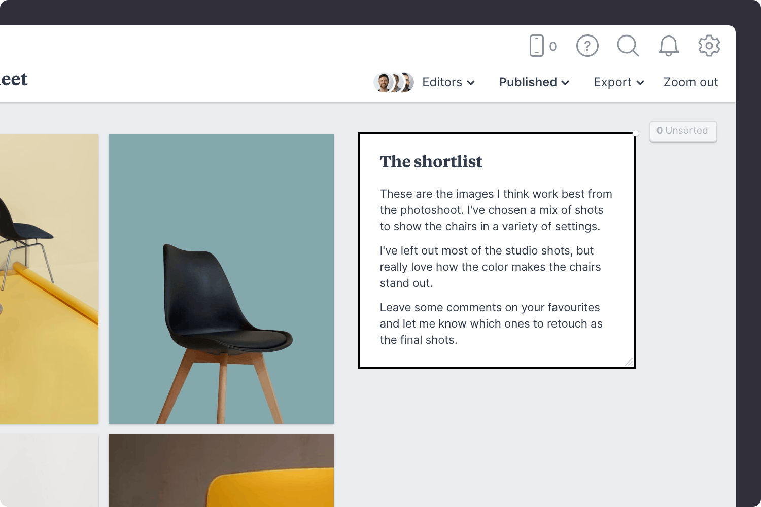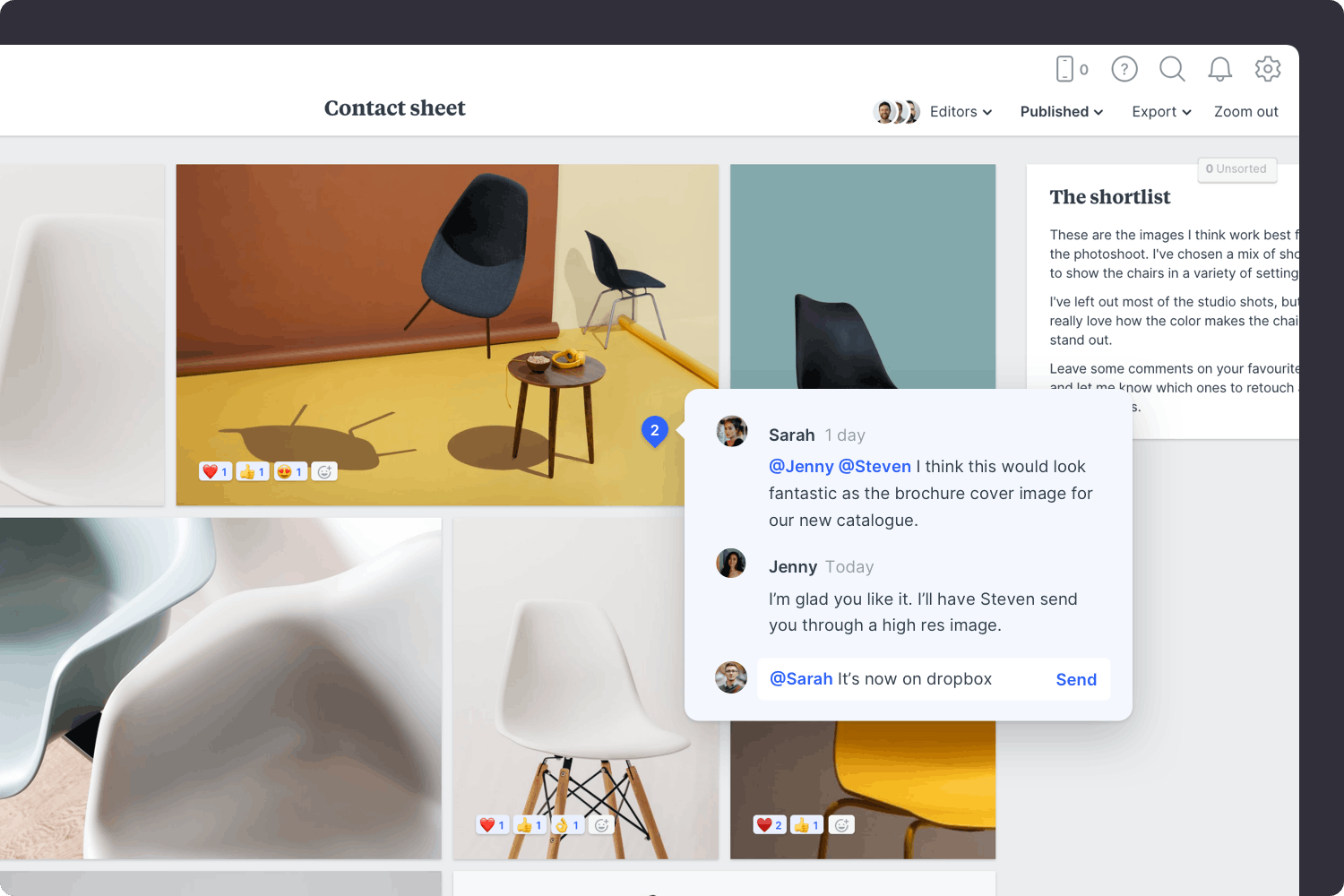 Once you've prepared your contact sheet, it's time to share it with your client. This is an exciting moment for them as it's usually the first time they've seen the output from your photoshoot. They can leave comments against the photos and vote for their favourites. It's much quicker and more collaborative than creating PDFs and emailing comments back and forth.
