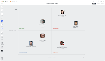 A stakeholder map is a technique you can use to analyse how different people will influence your project. By visualizing people on this matrix will make it easier to see where everyone fits on your project, and the level of communication you should be delivering to each person.